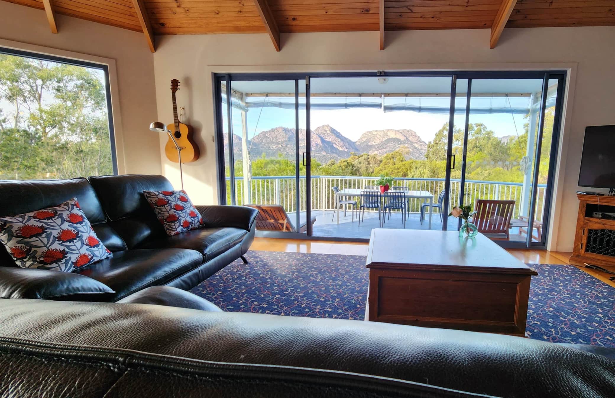Perched on a hill above Coles Bay, and surrounded by native gardens, this bright two-storey home spoils you with floor-to-ceiling windows that frame the bay and Hazard mountains. After exploring the Freycinet Peninsula, sit on the large deck, pour a glass of cool-climate wine and watch winter sunsets paint the mountains pink and (maybe) the aurora dance over Great Oyster Bay. Unwind on a two-night coastal stay which includes three bottles of Tasmanian wine and $20 for Granite Cafe.